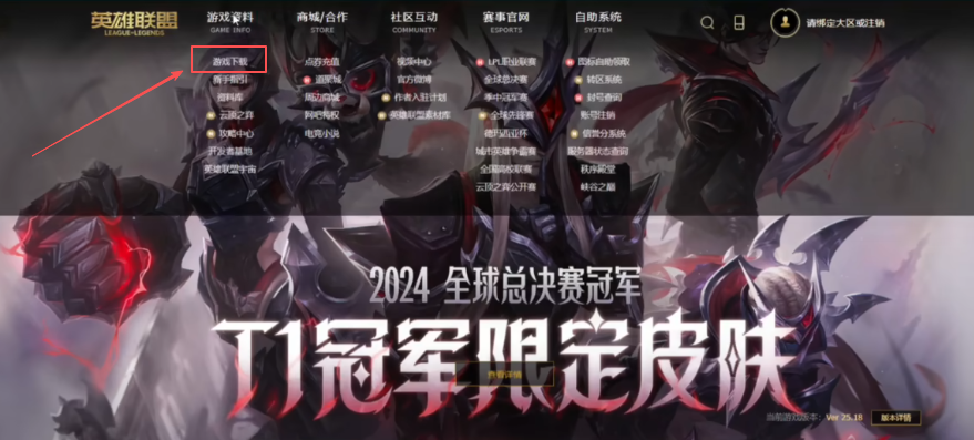 这是最直接的一个办法。你先打开英雄联盟的官方网站,在页面左上角找到“游戏资料”这个选项,点开下拉菜单,选择“游戏下载”。