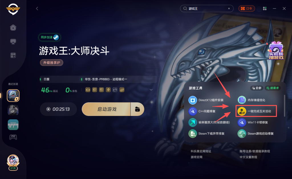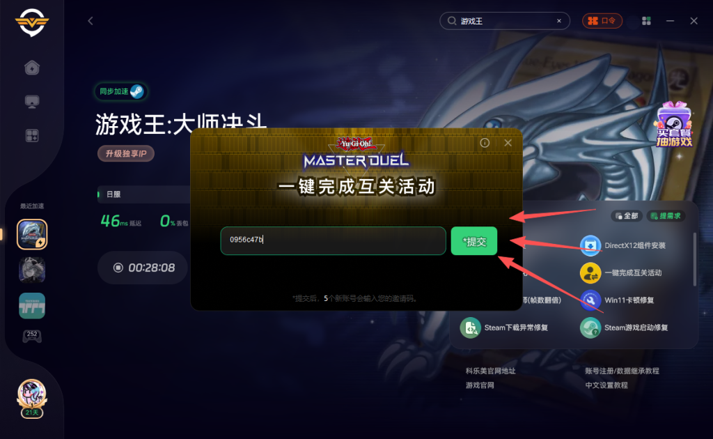 奇游加速《游戏王大师决斗》点击右侧的一键完成互关活动工具。