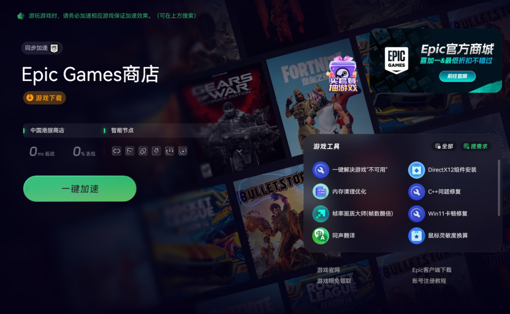 Epic商店登录不上,无法完成请求,转圈进不去问题可能是由于网络环境导致的问题,在打开Epic商店过程中,打开奇游加速工具搜索Epic商店,优化电脑本地网络的环境,解决因网络问题导致的Epic商店登录不上,无法完成请求,转圈进不去问题等情况。