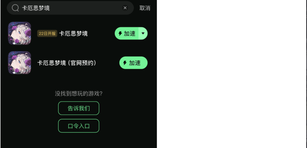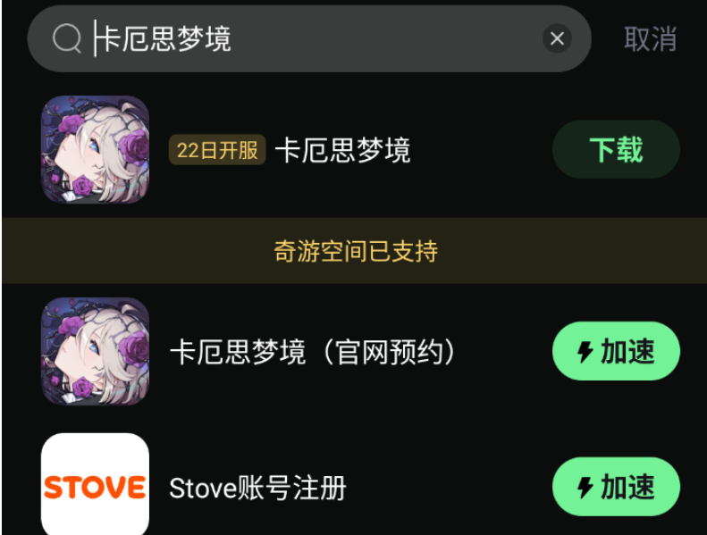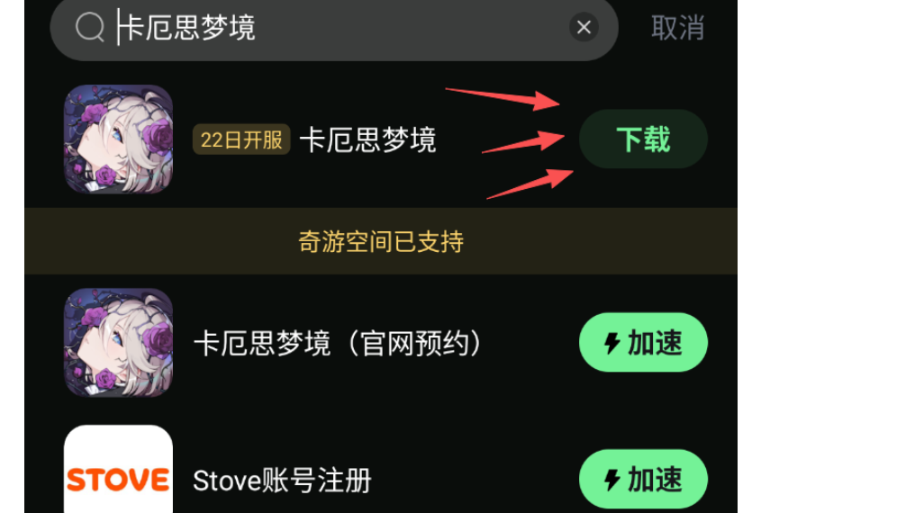 在搜索栏输入卡厄思梦境,点击口令入口,随后点击下载。下载完成后进行安装,安装完毕后使用奇游对游戏进行加速。
