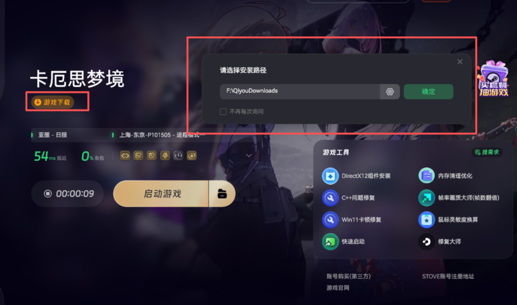 PC端用户使用奇游加速卡厄思梦境,点击橙色的游戏下载按钮,可一键下载启动器安装包。