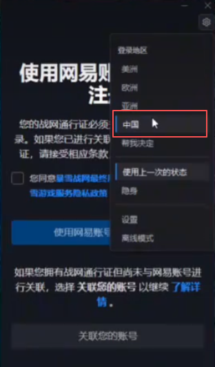 加速开启后,跟着指引下载并安装好战网客户端。安装完成后,先别急着登录,注意一下客户端右上角有个小齿轮设置图标,点进去把地区改为“中国”。这一步很重要,选错了可能就找不到游戏。