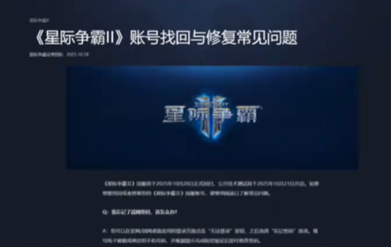 这次回归,需要把你以前玩《星际争霸二》时用的暴雪账号,和网易的国际服进行关联。万一你忘了当初的账号密码,或者遇到网易和暴雪实名信息对不上的情况,也别着急。你可以直接去《星际争霸二》的国服官网,上面有非常详细的账号找回与修复教程。