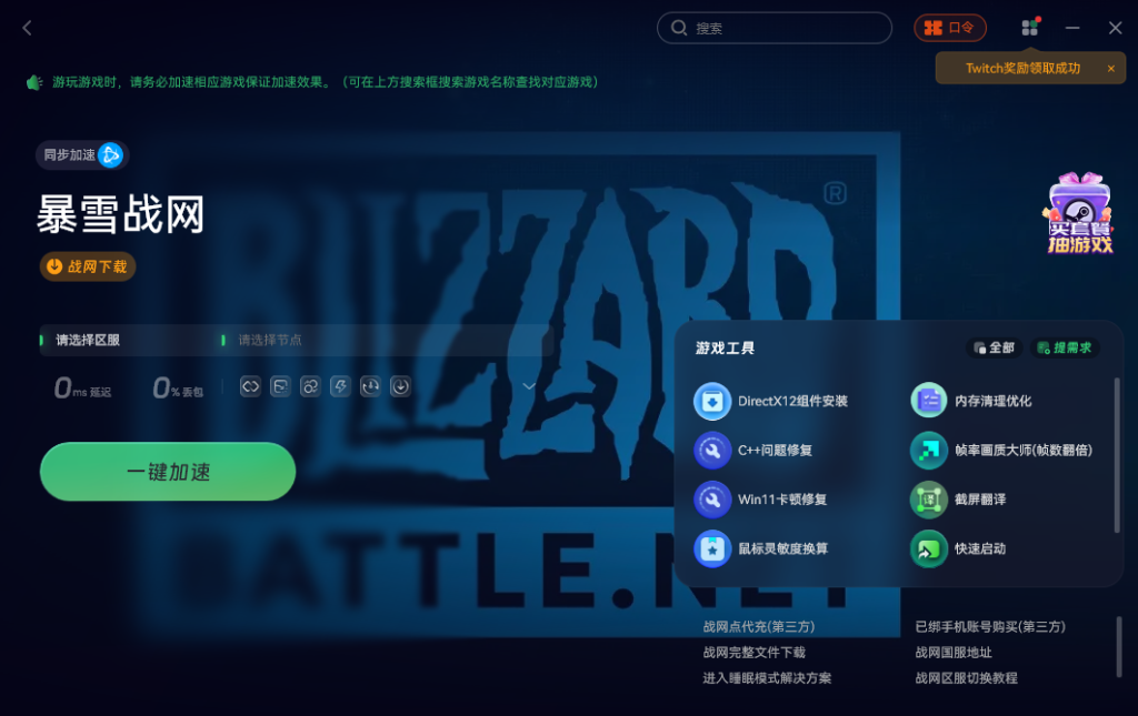 首先,你得准备一个暴雪战网的客户端。如果下载不顺利或者页面打不开,打开奇游加速工具,直接搜索“暴雪战网”进行加速,记得把节点切换到国服。