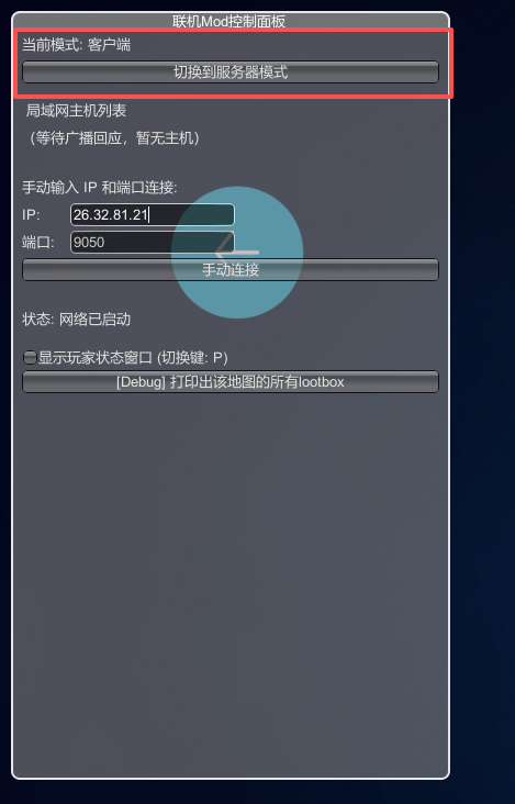之后主机进入游戏地堡大厅,按下home键呼出联机软件,主机切换为服务器模式