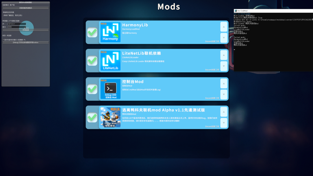 然后我们按顺序并打开mod,看到有这两个窗口就成功了,第一次开Mod需要重启游戏哦。
