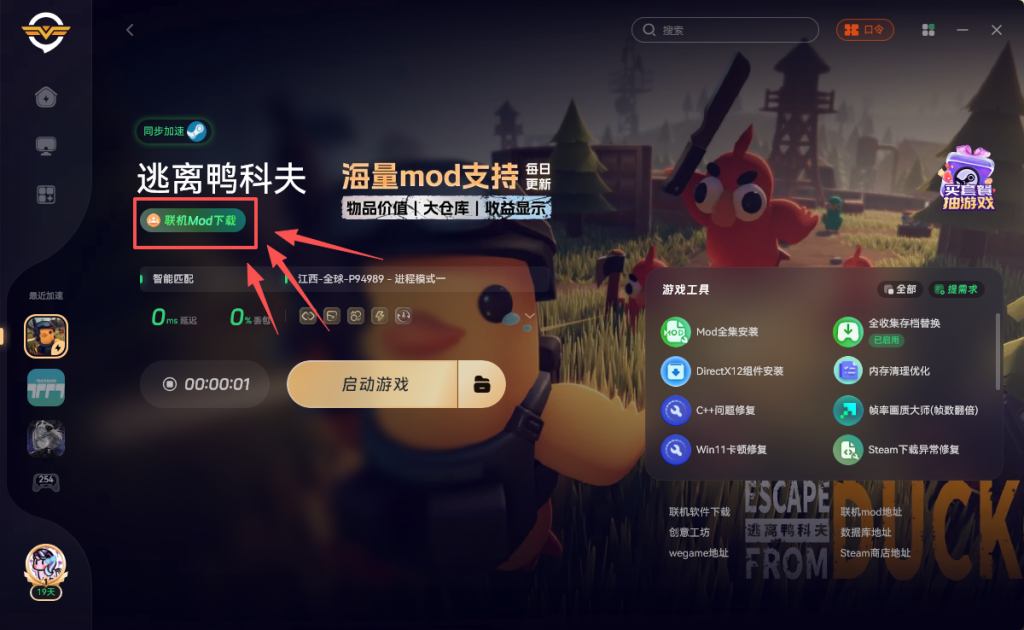 这两个都可以在奇游安装,打开奇游加速《逃离鸭科夫》点击橙色的联机Mod下载。