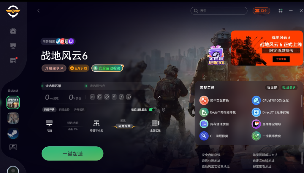 《战地 6》需实时从服务器加载地图数据,网络波动易导致加载卡住,奇游加速器可精准优化传输链路。具体操作:下载并安装奇游加速器,搜索 “战地 6” 后选择 “资源加载加速” 模式;优先挑选 “亚洲区低延迟节点”(延迟低于 60ms 最佳),点击 “开始加速”;加速成功后重启游戏,地图数据传输速度会显著提升,加载卡顿问题可大幅缓解。此外,在奇游加速器口令兑换处输入 “qy666”,还能免费领取 3 天会员时长。