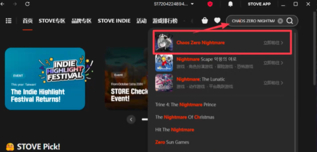 账号注册成功后启动预安装程序,为正式进入游戏做准备。在搜索游戏时输入游戏的英文原名Chaos Zero Nightmare,以免因名称差异而无法找到游戏。