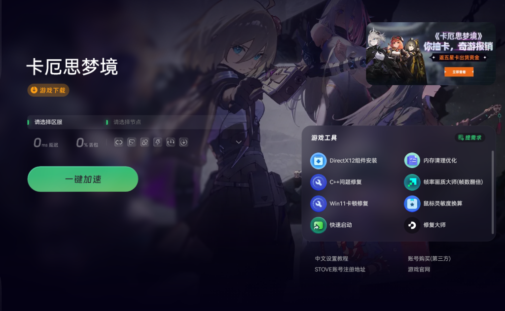 首先打开奇游加速工具,在右上角的口令输入框中准确键入QY666,获取免费的操作时长。随后在奇游中找到卡厄思梦境的专属页面,开启加速功能。