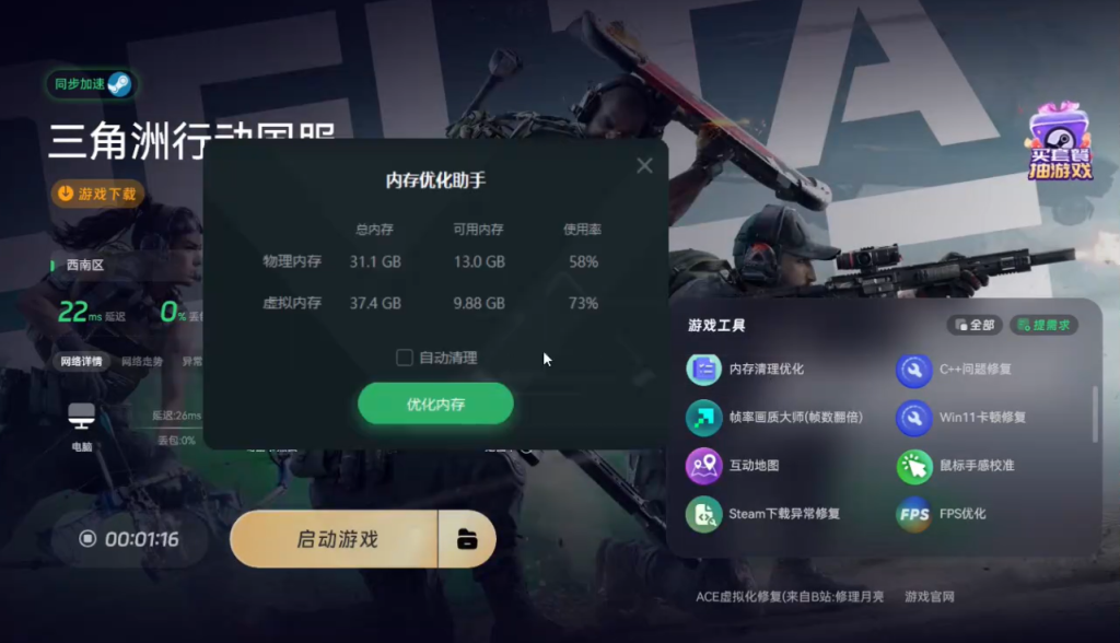 为进一步提升游戏性能,玩家还可使用奇游加速器的内存清理优化功能。点击奇游加速器右侧的内存清理优化按钮,并开启自动清理模式。完成后系统将自动优化物理内存及虚拟内存,为游戏运行提供更加稳定的环境。