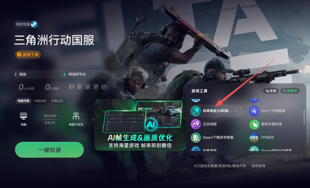 首先玩家需准备一款可靠的加速器,这里小编推荐奇游加速工具。启动奇游搜索三角洲行动,点击一键加速。等待加速完成后,找到并点击FPS优化功能。