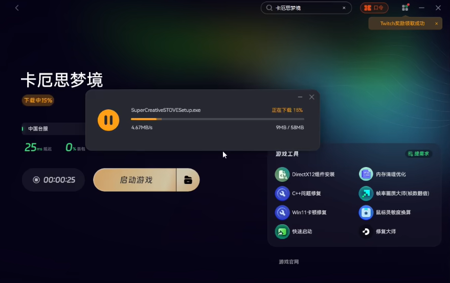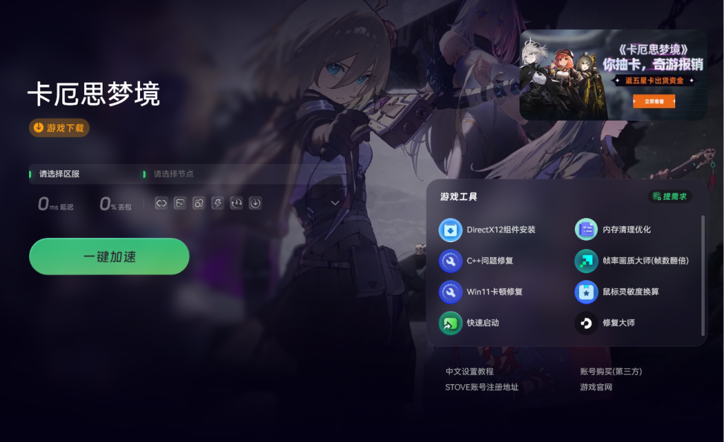 对于PC端玩家首先需准备奇游加速工具。打开奇游搜索卡厄思梦境,选定合适节点,点击一键加速。随后点击游戏下载工具并确认下载。