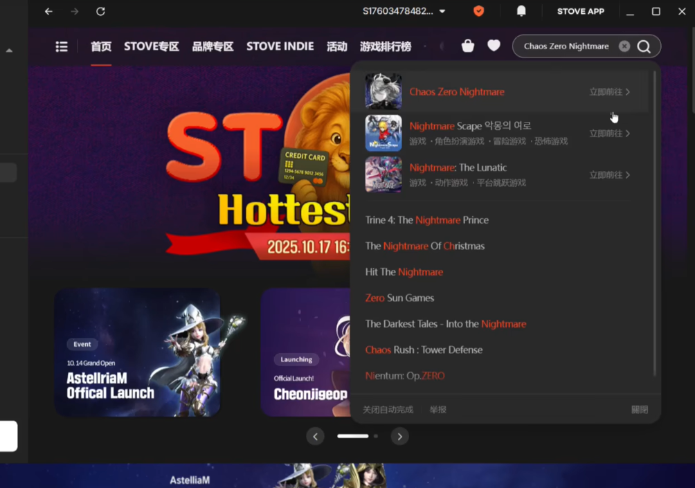 在商店页面搜索Chaos Zero Nightmare,点击立即前往进入网页,选择PC端事前下载并打开,返回stove平台即可下载游戏。