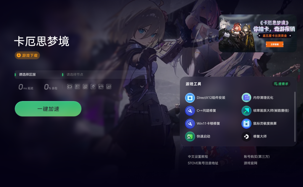 首先需要准备好奇游加速工具,打开加速器后在搜索框中输入卡厄思梦境,根据自身网络情况选择合适的节点,然后点击一键加速。