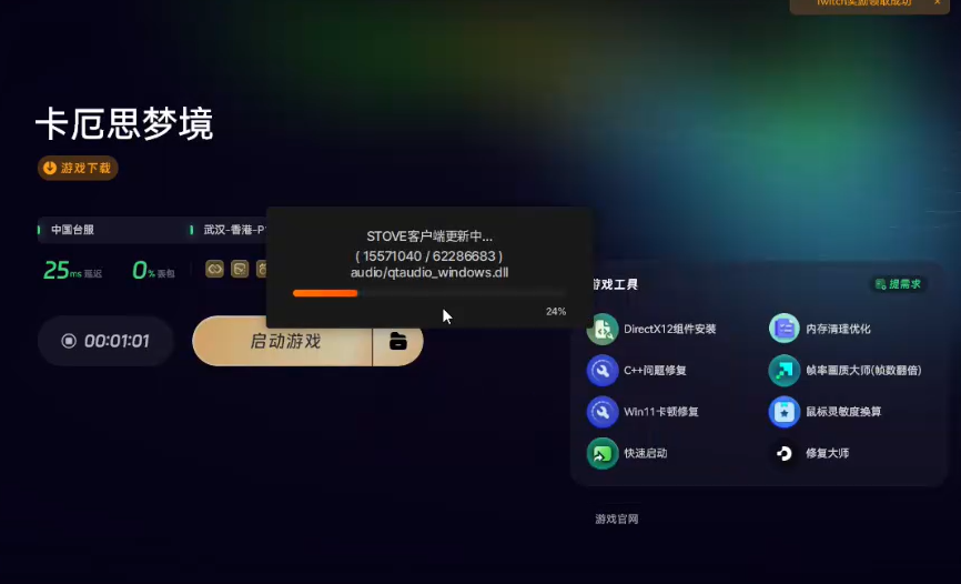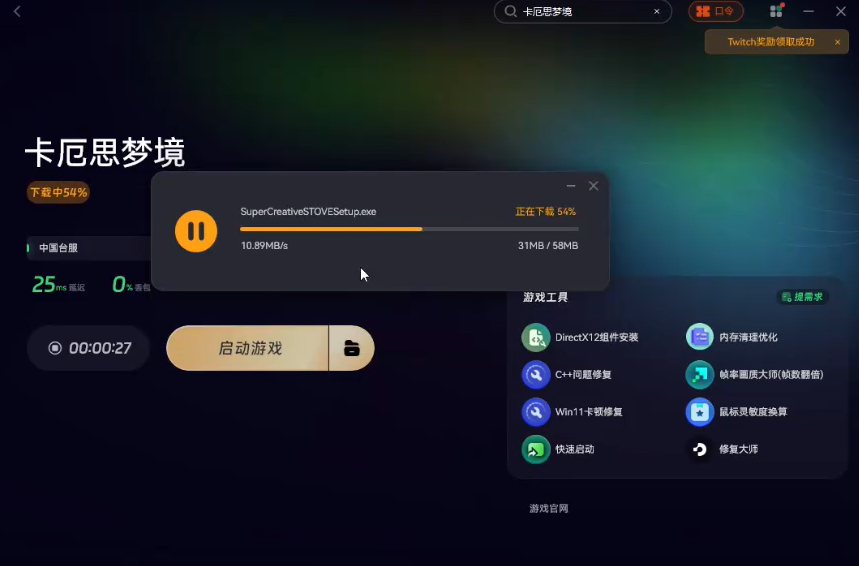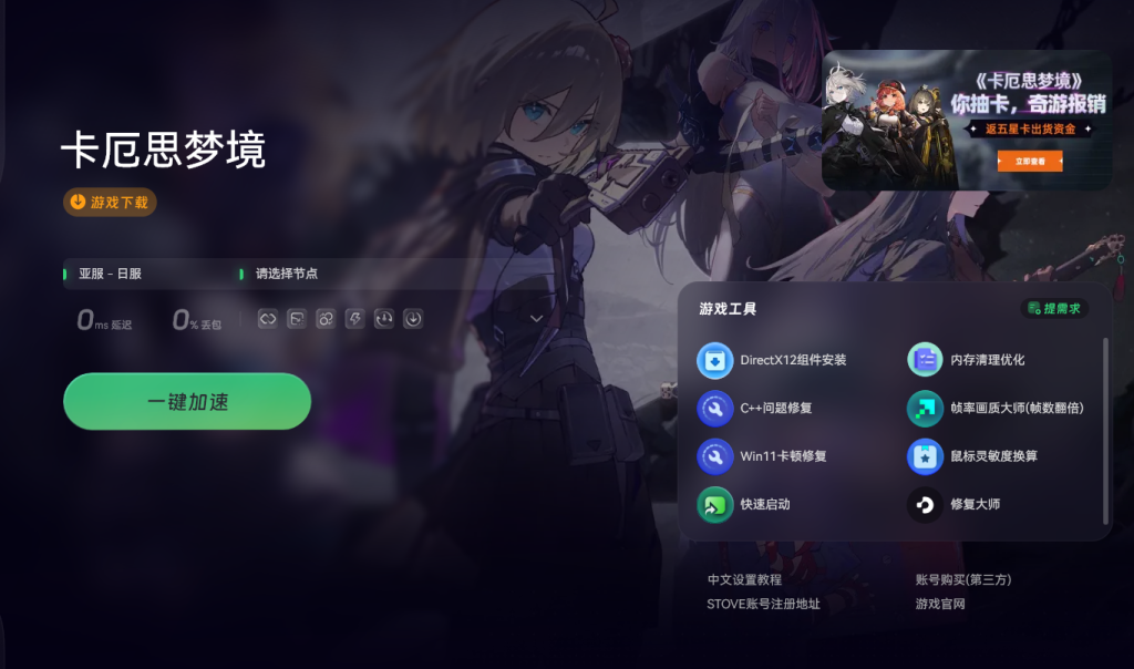 完成加速优化后,点击奇游加速工具界面中的“游戏下载”按钮,就能一键下载卡厄思梦境国际服的客户端。
