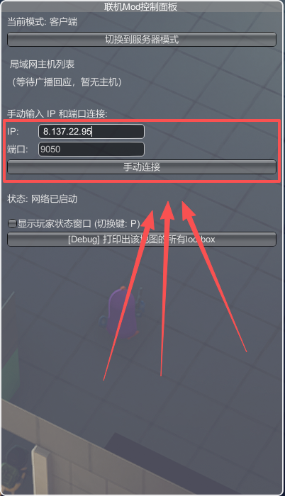 粘贴进ip,不要修改端口号,点击手动连接即可加入联机房间。