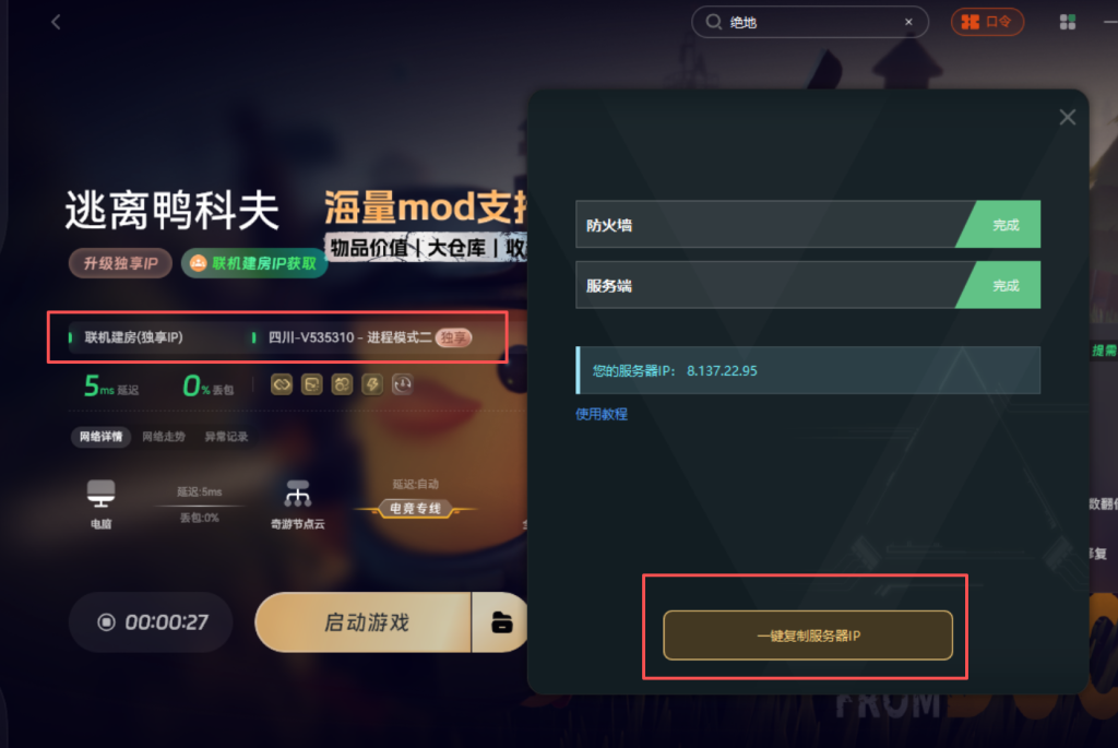 联机的关键步骤来了,主机玩家在奇游加速联机建房专属节点,之后点击联机建房IP获取,可以看到地址,复制给你的好友