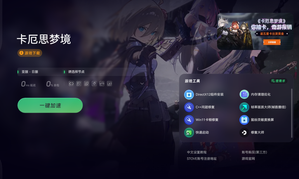 首先准备一个奇游加速工具,在加速器中搜索卡厄思梦境,选择合适的节点后,点击一键加速。