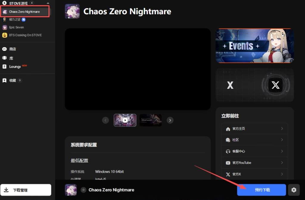 PC端用户打开奇游工具,加速卡厄思梦境,然后点击页面上橙色的游戏下载按钮,下载STOVE客户端。