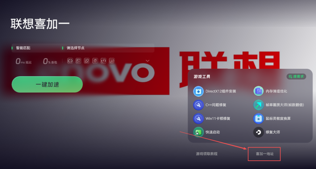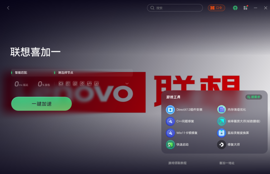 由于联想活动页在国内网络环境下经常打不开,推荐先用加速工具处理一下。比如打开奇游加速工具,搜索“联想喜加一”并开启加速。