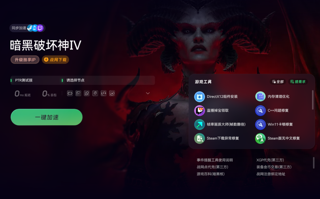 首先准备一个奇游加速器。打开加速器后,在搜索框输入暗黑4,选定PTR测试服,随后进行智能加速操作。