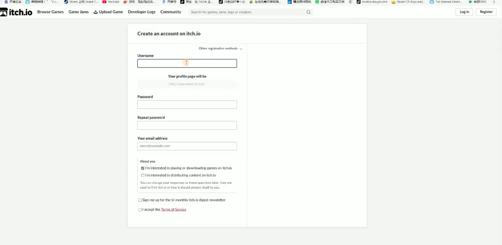 成功进入官网后,要注册一个账号。点击页面右上角的register,然后设置账户名、密码以及邮箱地址,这里对邮箱类型没有限制,任何邮箱都可以。