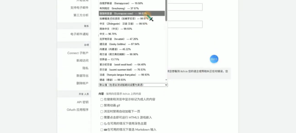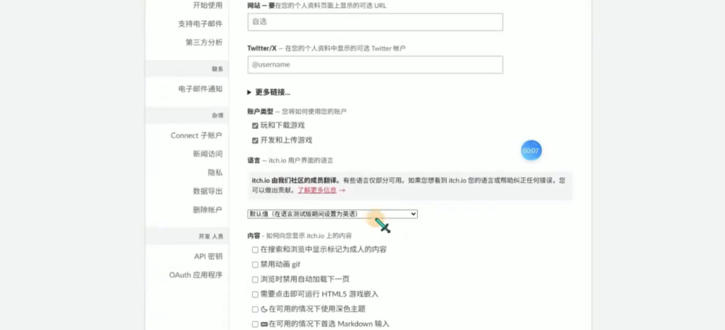 itch官网是内置中文的不过需要登录账号后才能设置。登录账号后,点击右上角的头像,选择settings,接着下拉页面找到语言栏,从中选择简体中文完成中文设置。