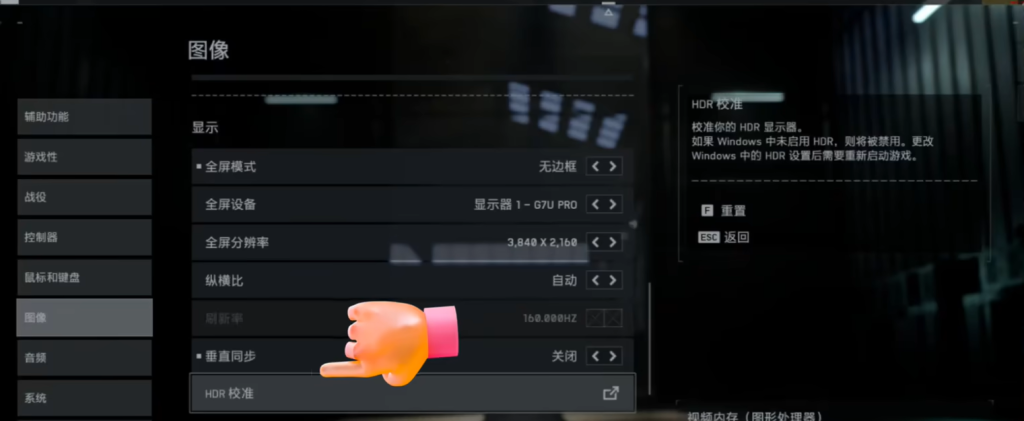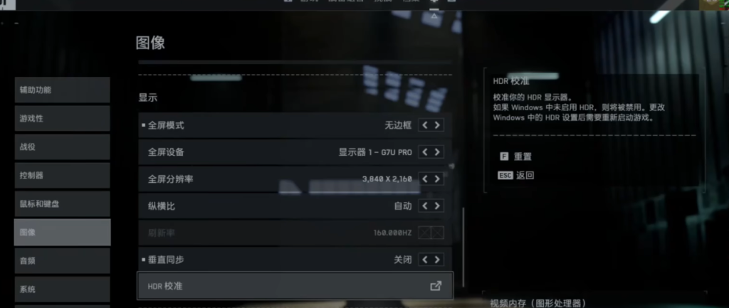 进入游戏后打开设置里的图像选项,下拉至显示部分,点击HDR校准。通过调整滑块,使左边灰色部分与白色部分大小一致,或者略小一点,这样就能正常玩游戏了。