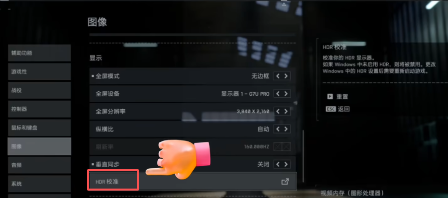 进入任意一局游戏后,打开设置—图像选项,找到“显示”部分,选择“HDR校准”。