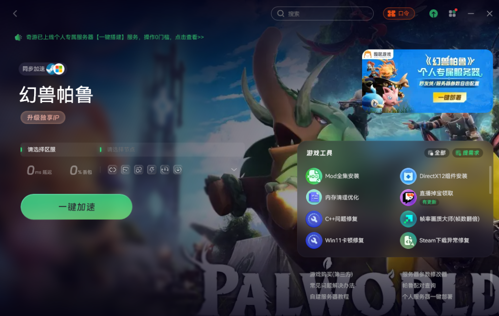 在打开《幻兽帕鲁》过程中,打开奇游,搜索”幻兽帕鲁”。优化电脑本地网络的环境,从而解决因网络问题导致的《幻兽帕鲁》更新后进不去游戏、闪退、崩溃、黑屏、报错、网络连接超时等情况,顺利解决问题。