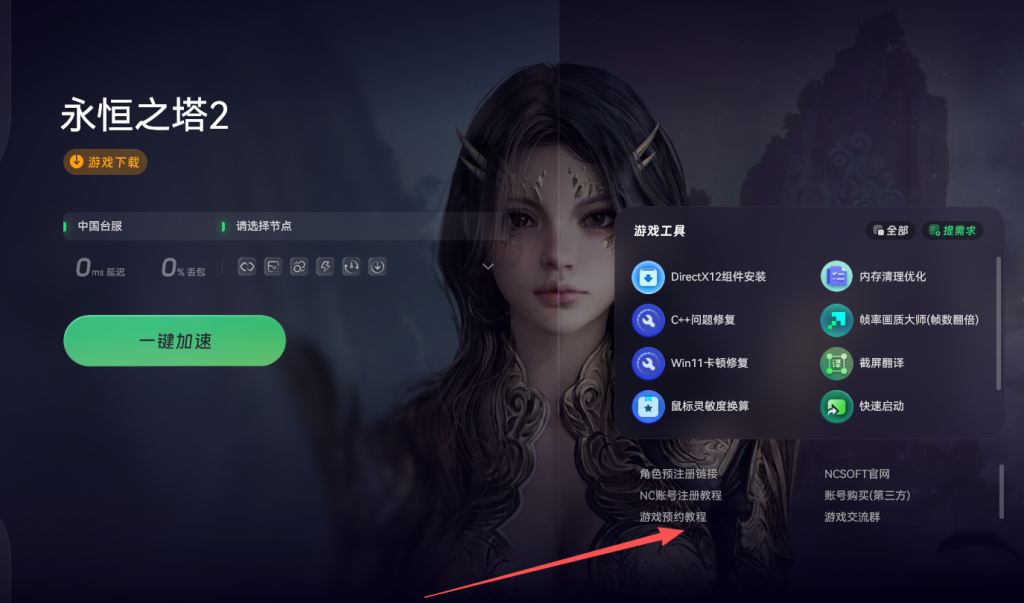 游戏公测定于11月18日正式开启,若想第一时间踏入游戏世界,现在就得着手准备预注册与下载工作。首先打开奇游加速工具,搜索永恒之塔2进行加速。加速完成后,在详情页中找到事前预约教程按钮,点击进入。