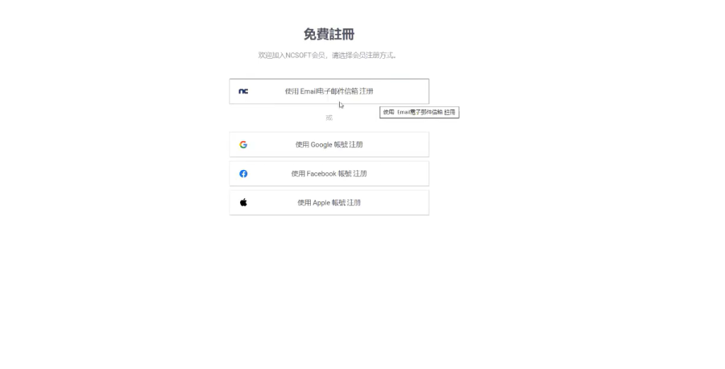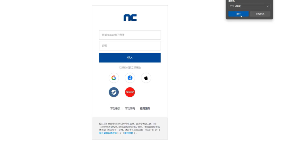 选择好地区后,点击前往浏览器登录,接着点击下方免费注册,即可开始注册NC账号。
