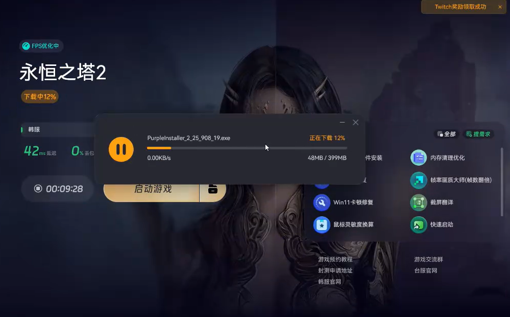 加速完成后,点击游戏下载一键下载并安装Purple客户端。安装好Purple客户端后,打开并选择地区,这里务必选择台湾,以免出现地区错误。