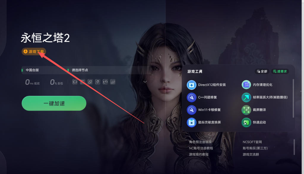 加速完成后下载游戏。点击官方游戏下载按钮,将客户端安装至电脑。安装时,请确保选择台服作为地区。