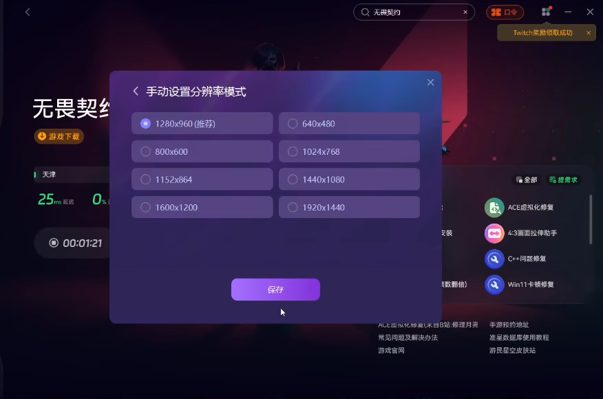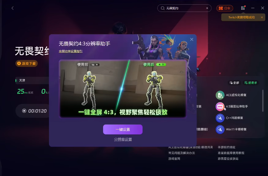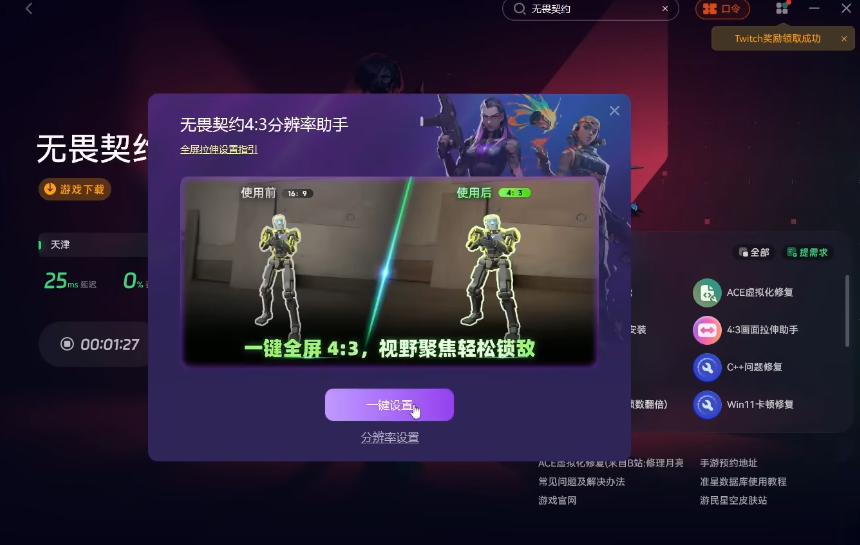 完成网络加速后,在加速工具的主界面中,找到四比三画面拉伸助手功能点击进入。进入该功能页面后,能看到分辨率设置选项,点击它。