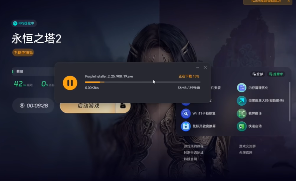在Purple平台登录方面选择全球服通常可正常登录。如果遇到登录失败、无法打开或报错等情况,可以重新下载Purple平台。打开奇游加速工具,搜索永恒之塔2进行一键优化,随后点击上方的游戏下载按钮,下载最新的Purple平台。