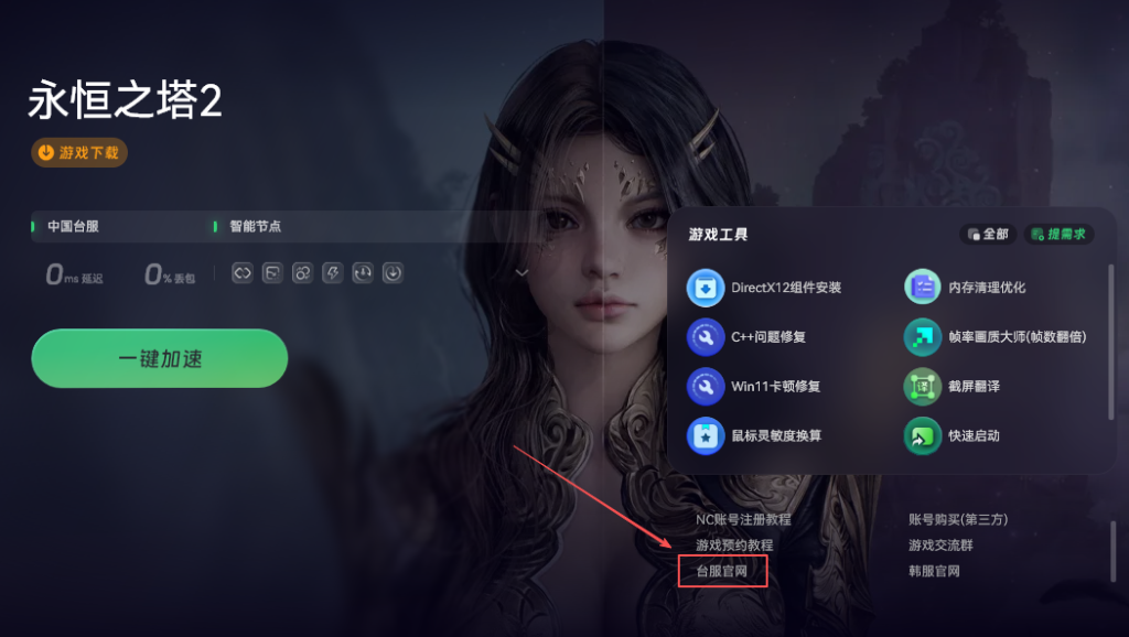 因为游戏服务器在海外,国内玩家直连可能会卡顿或者掉线。建议提前准备好网络加速工具,比如奇游加速工具。它专门针对各类游戏做了优化,能有效降低延迟、稳定连接,特别适合玩外服游戏。打开奇游加速工具,接着在加速器里搜索“永恒之塔2”,点击加速。
