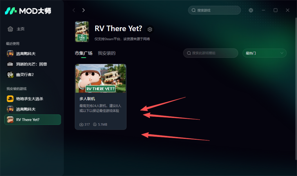 选择多人联机mod并一键安装,即可解锁24人联机哦。