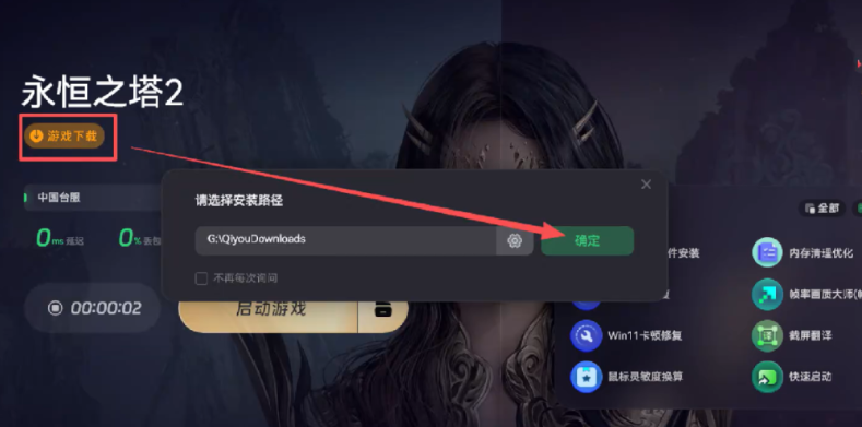 加速状态下,点击奇游加速器界面上方标注 “游戏下载” 的按钮(多位于工具顶部功能栏,图标为 “下载” 样式),系统会自动跳转至《永恒之塔 2》台服客户端下载页面。