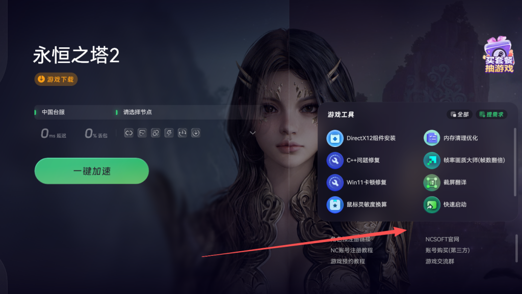第一步打开奇游加速工具,在搜索栏中输入永恒之塔2,找到游戏后点击加速。在加速详情页面设有官网通道,点击此通道进行跳转。