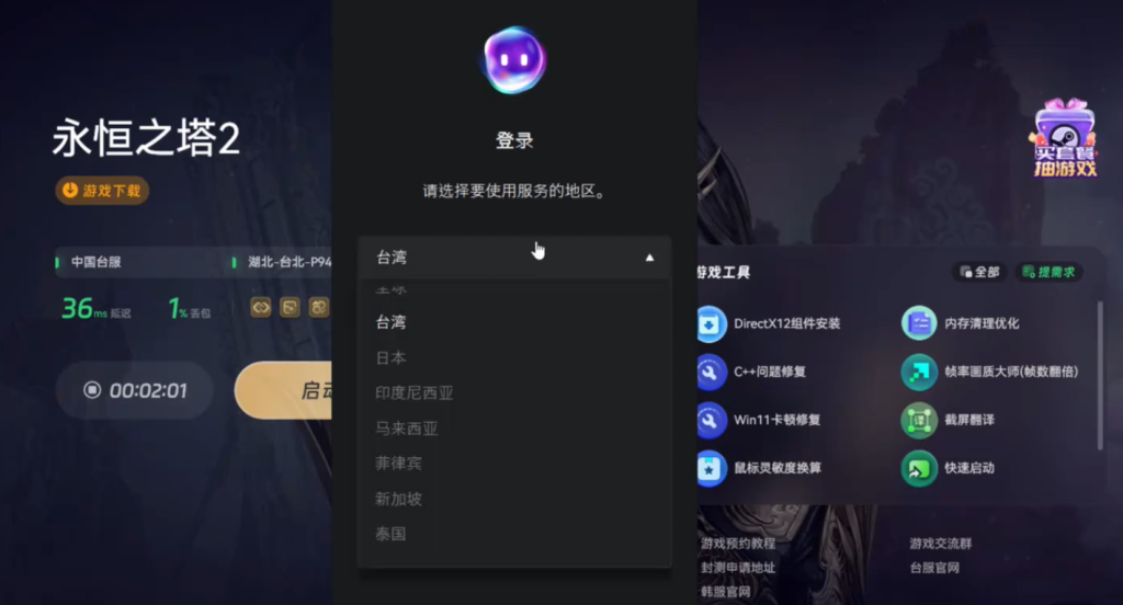 安装完成后,打开游戏启动器,将地区设置为台湾。选择通过浏览器登录。如果你还没有账号,点击下方的免费注册选项。
