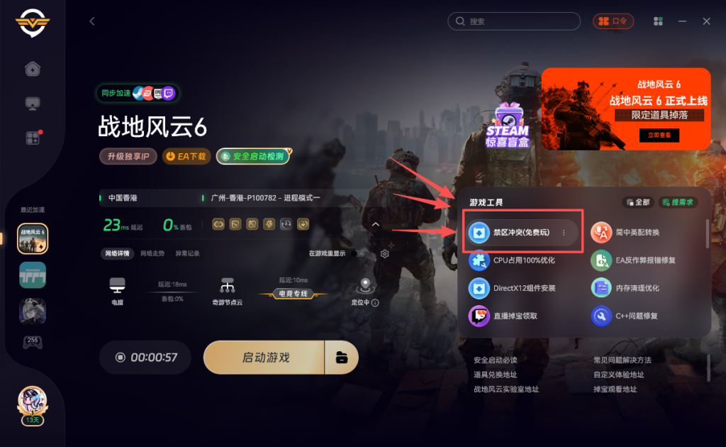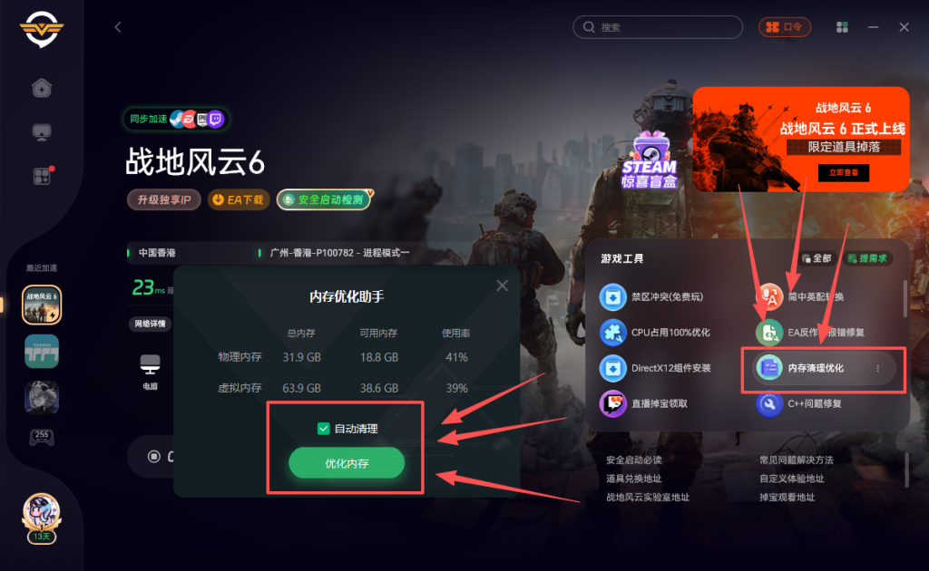 如果还是帧数低卡顿掉帧黑屏闪退的玩家,可能是内存不够导致的。我们可以清理一下内存,打开奇游工具,加速《战地6》点击右侧的内存清理优化,勾选自动清理并点击绿色的优化内存即可一键清理内存哦。