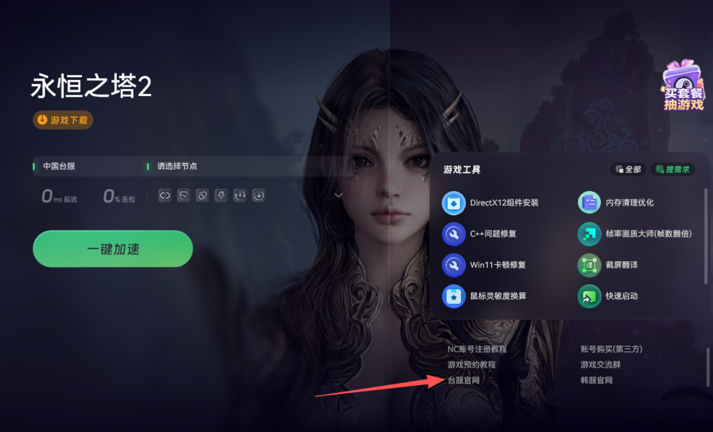 加速成功后在加速界面找到并点击旁边的台服官网入口,进入永恒之塔2台服官方网站直接输入账号和密码登录。