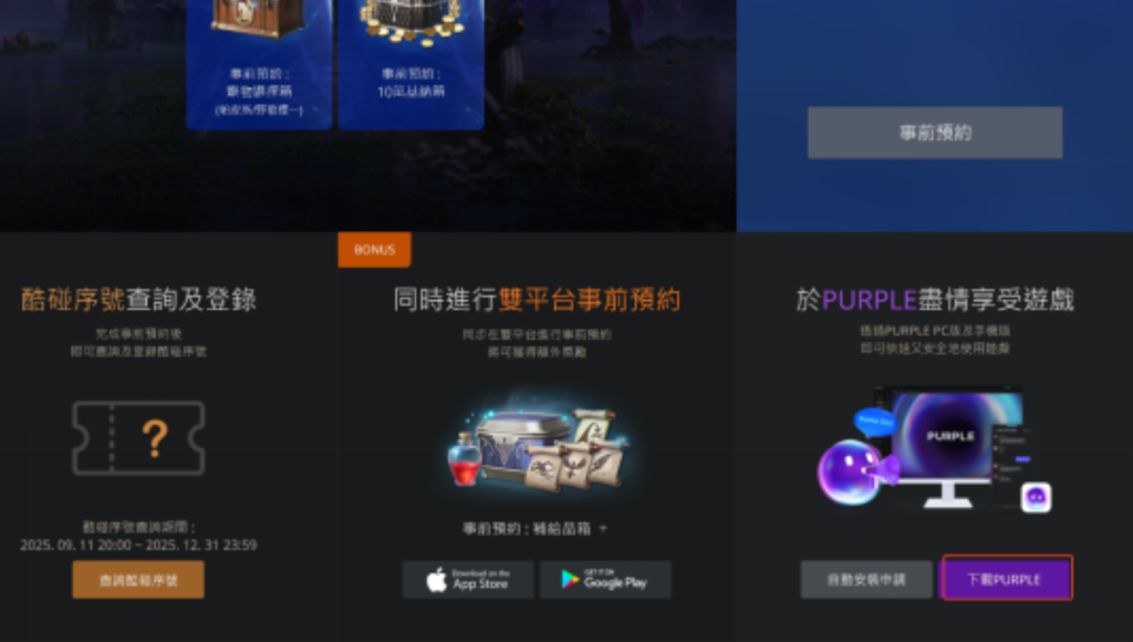 在官网预约页面向下浏览,找到PURPLE平台入口,点击进入后下载安装包。安装完成后,打开客户端,先在全球选项中将地区切换至台湾,然后选择浏览器登录,输入已注册好的PLAYNC账号。