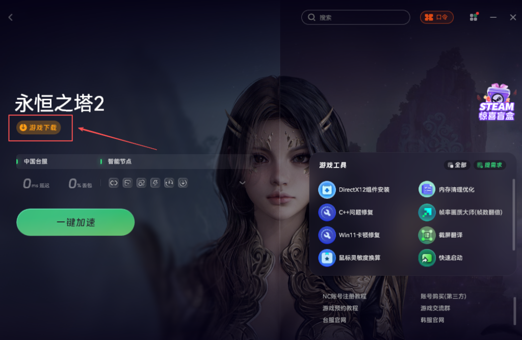 网络搞定后,就可以开始下载游戏了。在加速页面里一般有游戏下载的入口,安装好客户端之后,记得选择台服地区。