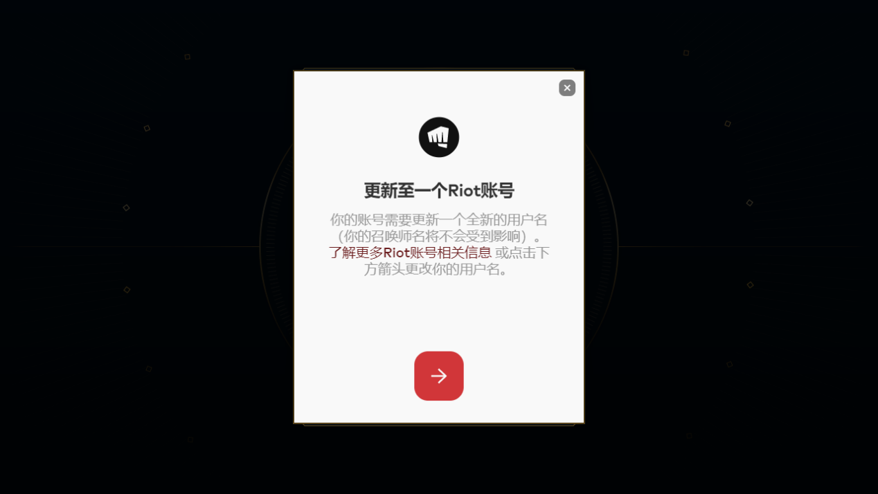 如果弹出“更新至一个Riot账号”的界面,直接点击弹窗右上角的“X”即可正常进入游戏: