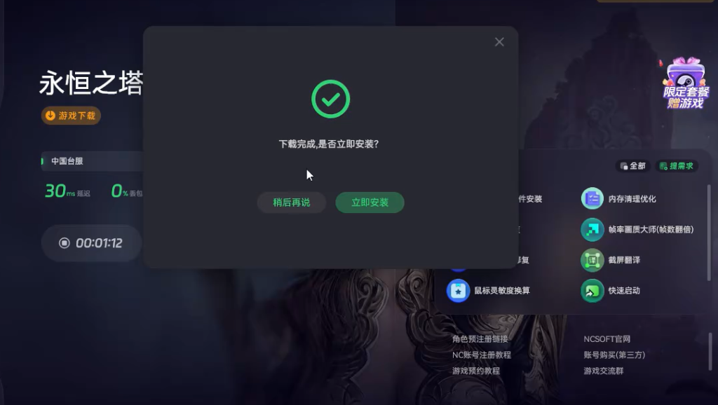 首先开启奇游加速工具点击一键加速。留意检查所选区服是否准确无误。加速操作完成后,在加速工具界面上方点击“游戏下载”按钮。