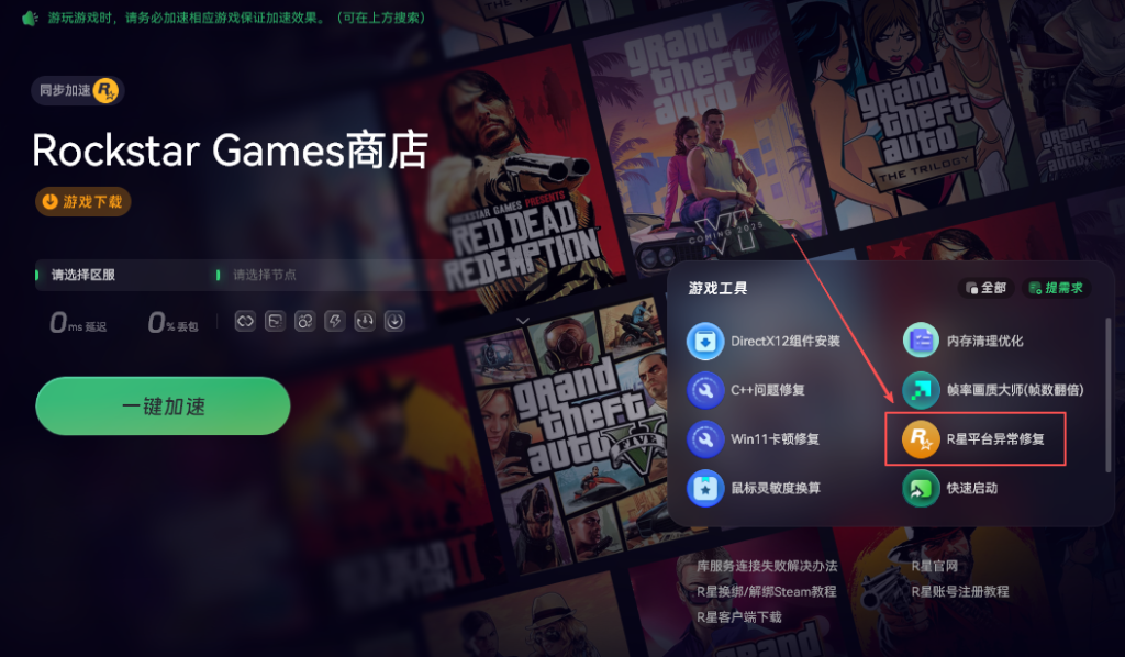 奇游加速工具提供了针对R星平台的修复功能。可以深入检测R星平台在运行过程中可能出现的各种问题,包括但不限于文件损坏、配置错误等,并对这些问题进行自动修复。通过这一功能,能够有效解决连接验证码服务出错以及离线模式无法建立连接等问题,让玩家顺利进入游戏。