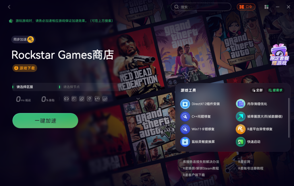 在打开R星过程中,打开奇游,搜索”R星”。优化电脑本地网络的环境,从而解决因网络问题导致的R星进不去、库服务连接失败、账号登不上去、卡更新转圈、无法处理请求等情况。